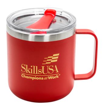 - Product Description: 12 oz. mug w/ a stainless steel rim that fits a clear push on lid w/ a swivel closure. Decorated w/ “SkillsUSA Champions at Work” logo.
