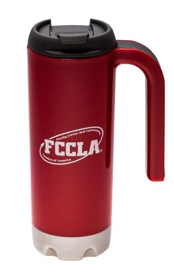 - Product Description: Travel mug that features a stainless steel base and snap-fit lid. FCCLA logo is decorated on the front of the mug.