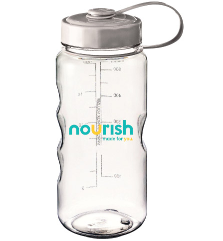 - Product Description: An 18 oz. tritan plastic bottle; has a screw-on cap with loop attachment; decorated with the “nourish made for you.” logo.