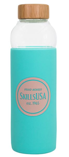 - Product Description: Glass bottle that features a protective silicone sleeve w/ “PROUD MEMBER SkillsUSA est. 1965” printed on it and twist-on bamboo lid.