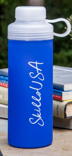 - Product Description: 20 oz. glass bottle w/ a blue silicone sleeve that is decorated w/ SkillsUSA logo.