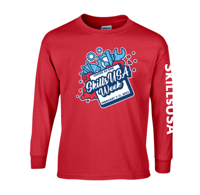- Product Description: This red long sleeve t-shirt has the text “SKILLSUSA” up the left arm, as well as the SkillsUSA Week logo in the center of the chest (see image).