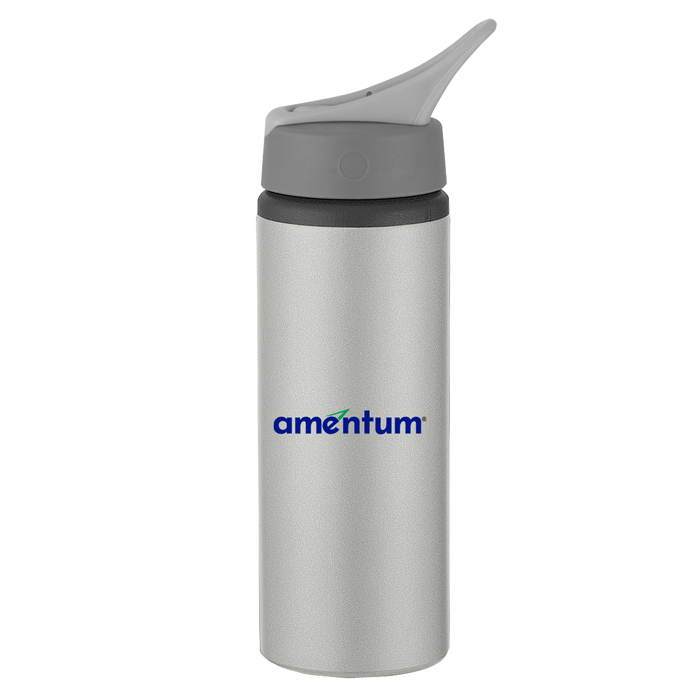 - Product Description: This 25oz silver water bottle has the classic Amentum logo on it.