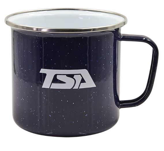 - Product Description: Navy blue mug w/ white speckles and white “TSA” logo.