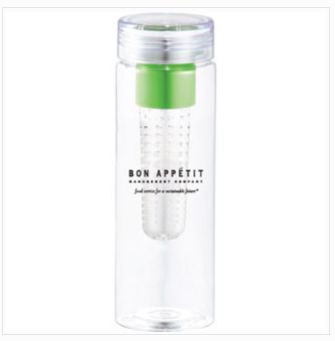 - Product Description: Clear infuser bottle w/ green infuser and Bon Appetit logo.