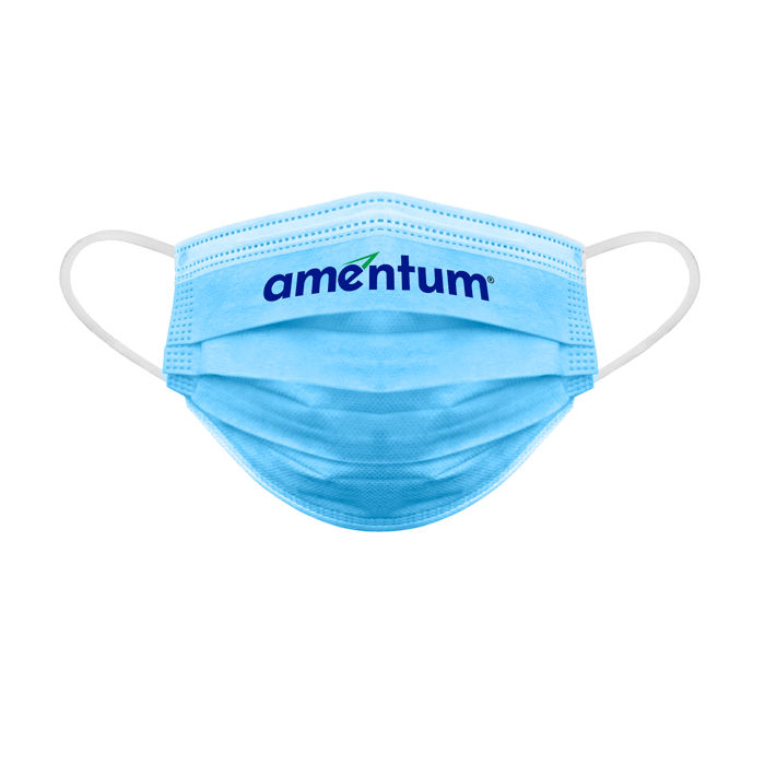 - Product Description: Light blue face mask with the Amentum logo across the top of the mask.