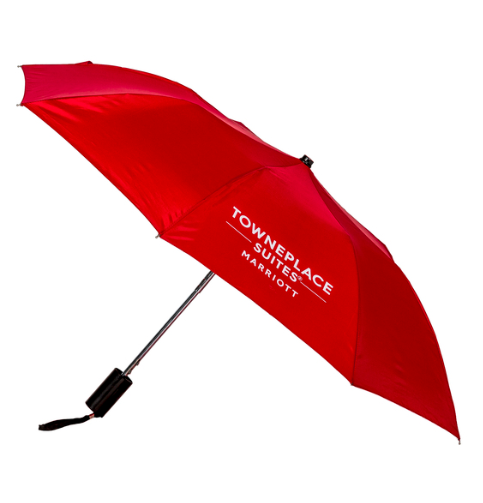 - Product Description: Red 36″ folding umbrella with a black plastic handle and wrist strap; folds to 14″; decorated with the Towneplace Suites by Marriott logo