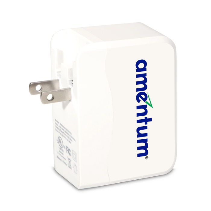 - Product Description: This white 4 port USB chargers has the Amentum logo on the side.