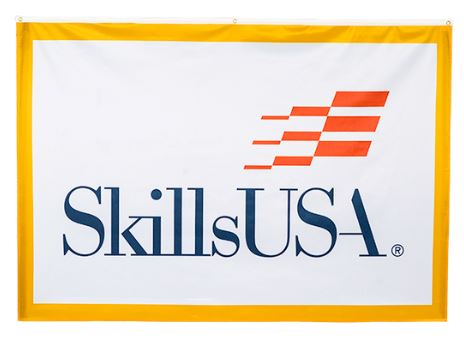 - Product Description: 4′ W x 6′ H white flag w/ gold border and solid brass grommets. SkillsUSA logo printed on the front.
