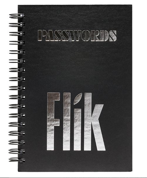 - Product Description: Black spiral notebook that contains 50 password log sheets. Stamped with the Flik logo in the middle and “passwords” at the top of the notebook. Sold in packs of 6.