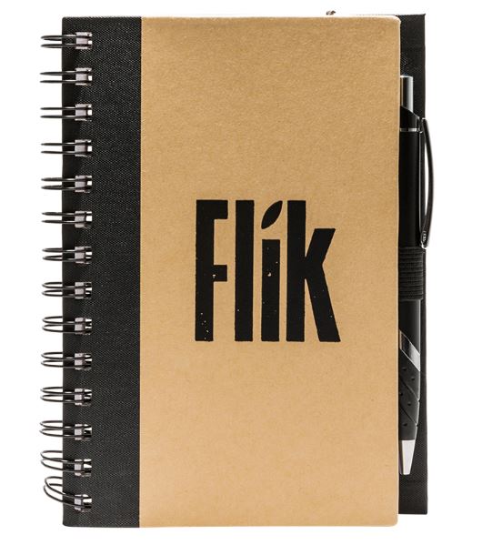 - Product Description: This set includes a 5″ X 7″ notebook with 100 sheets of paper, Script Sharkbite Ballpoint pen, elastic pen loop and elastic closure. Black Flik logo imprinted on front of notebook. Sold in packs of 12.