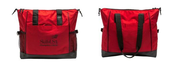 - Product Description: This sturdy tote bag measures at 14.5 L x 17″ H x 4-1/2″ W and features velcro pockets, mesh side pockets, and reinforced straps and handles. SkillsUSA logo printed on the front of the tote bag.
