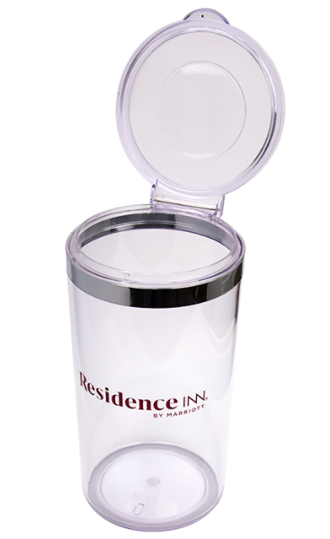 - Product Description: A 46 oz. clear canister with a hinged lid; decorated with the Residence Inn by Marriott logo.