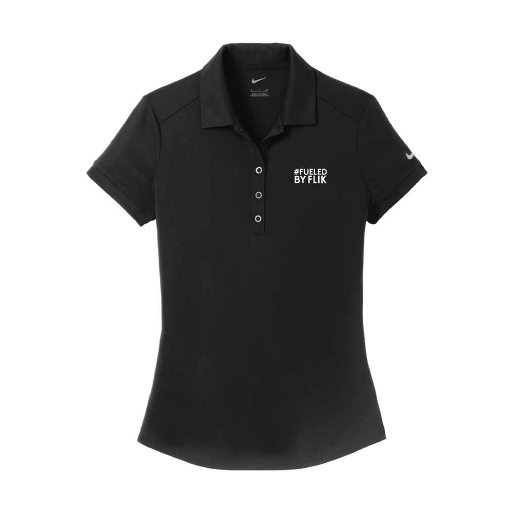 - Product Description: This black women’s Nike polo has the text “#FUELED BY FLIK” on the upper left chest.