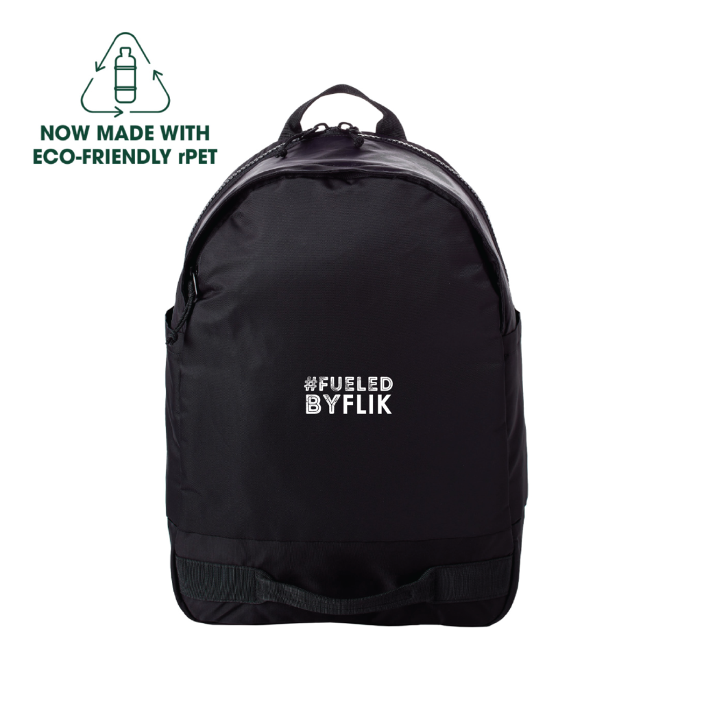 - Product Description: This black backpack can fit a 16″ laptop and is decorated with the text “#FUELEDBYFLIK” on the front center of the bag.