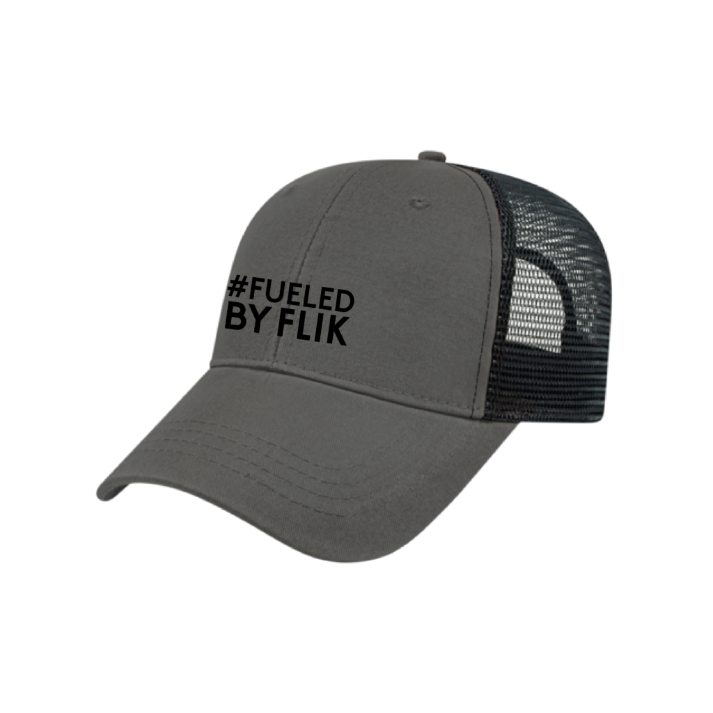 - Product Description: This charcoal trucker hat with black mesh is decorated with the text “#FUELEDBYFLIK” in black.